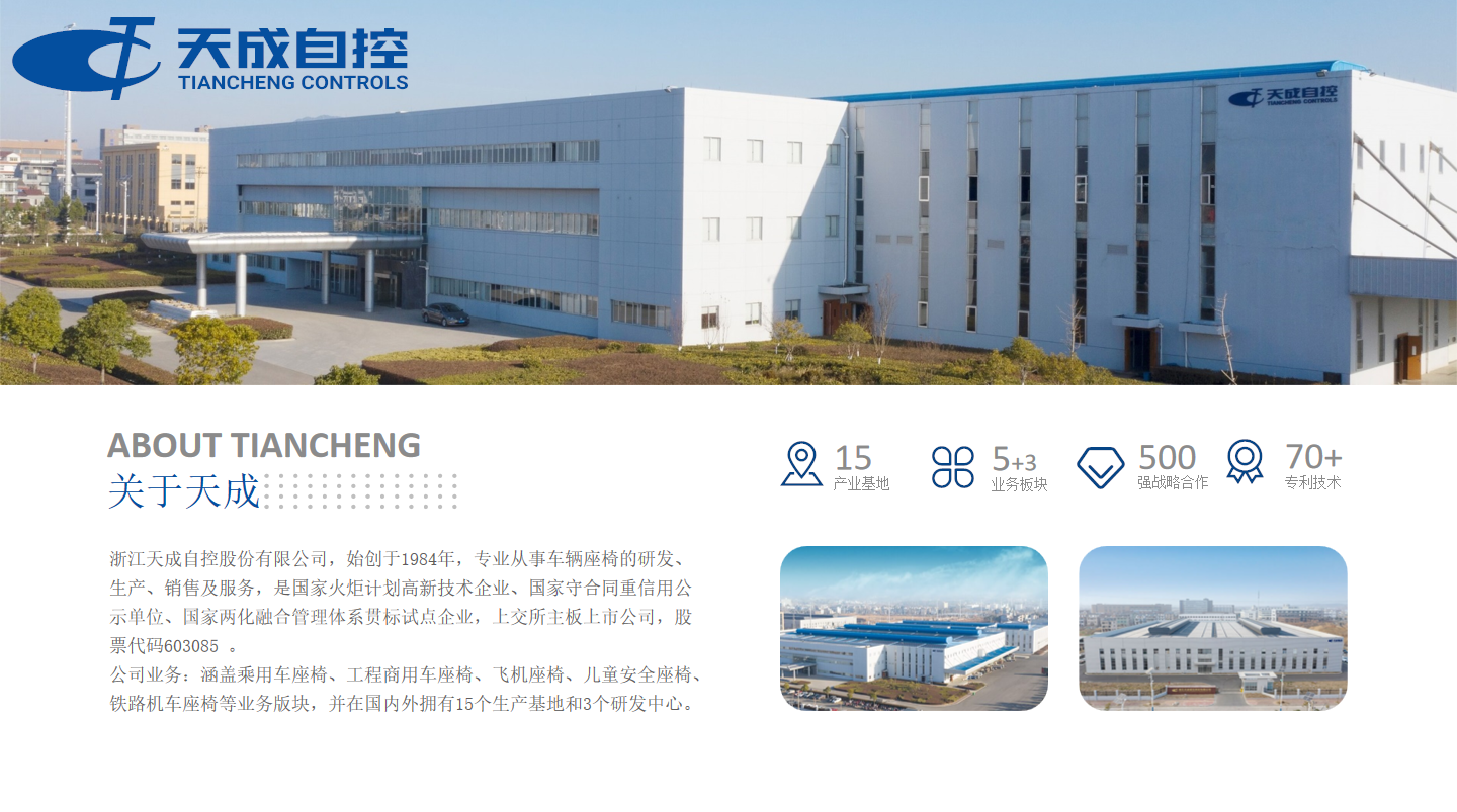 天成自控:以精工铸座椅,以初心赴征程 深植天台产业厚土,浙江天成自控股份有限公司自1984年始创以来,始终坚守“提供舒适安全的座椅,以科技创新生活品质”的企业使命,在四十载深耕中书写了从区域配件厂到全球座椅专业供应商的跨越传奇。2015年登陆上交所主板(股票代码:603085),如今已构建15个生产基地与3个研发中心的全球化布局,业务覆盖工程机械、商用车、乘用车、航空、儿童安全等多元领域,成为卡特彼勒、三一重工、蔚来等知名企业的核心配套商。 “正直、标准、卓越、团队、承诺、感恩”的核心价值观,是天成自控行稳致远的精神根基。作为国家火炬计划高新技术企业与行业标准起草单位,公司以300余项专利技术筑牢创新壁垒,深耕智能化、轻量化、平台化研发方向,镁铝合金与碳纤维一体成型技术引领行业趋势,全贴合腰托技术将座椅疲劳度降低40%。通过与高校共建联合实验室、打造工业4.0智能工厂,实现48秒/套的行业领先生产节拍,用工匠精神诠释“品质是企业生命线”的坚守。 秉持“以人为本、共赢发展”的经营哲学,天成自控对内构建人才成长沃土,通过完善的培训体系与激励机制凝聚团队力量;对外主动担当社会责任,以“绿色工厂”标准践行环保承诺,在村企共建、公益回馈中传递温度。如今,公司正以“十年跻身行业前三”为目标,在全球化浪潮中坚守诚信底色,以技术创新赋能产业升级,用责任与担当诠释新时代企业家精神,向着“世界一流座椅专业供应商”的愿景笃定前行。